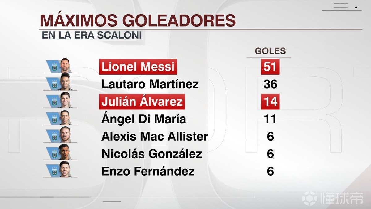 赛后根据统计,算上本场比赛的进球,梅西和胡利安-阿尔瓦雷斯分别以51球和14球位列斯卡洛尼治下阿根廷队的第一和第三射手。